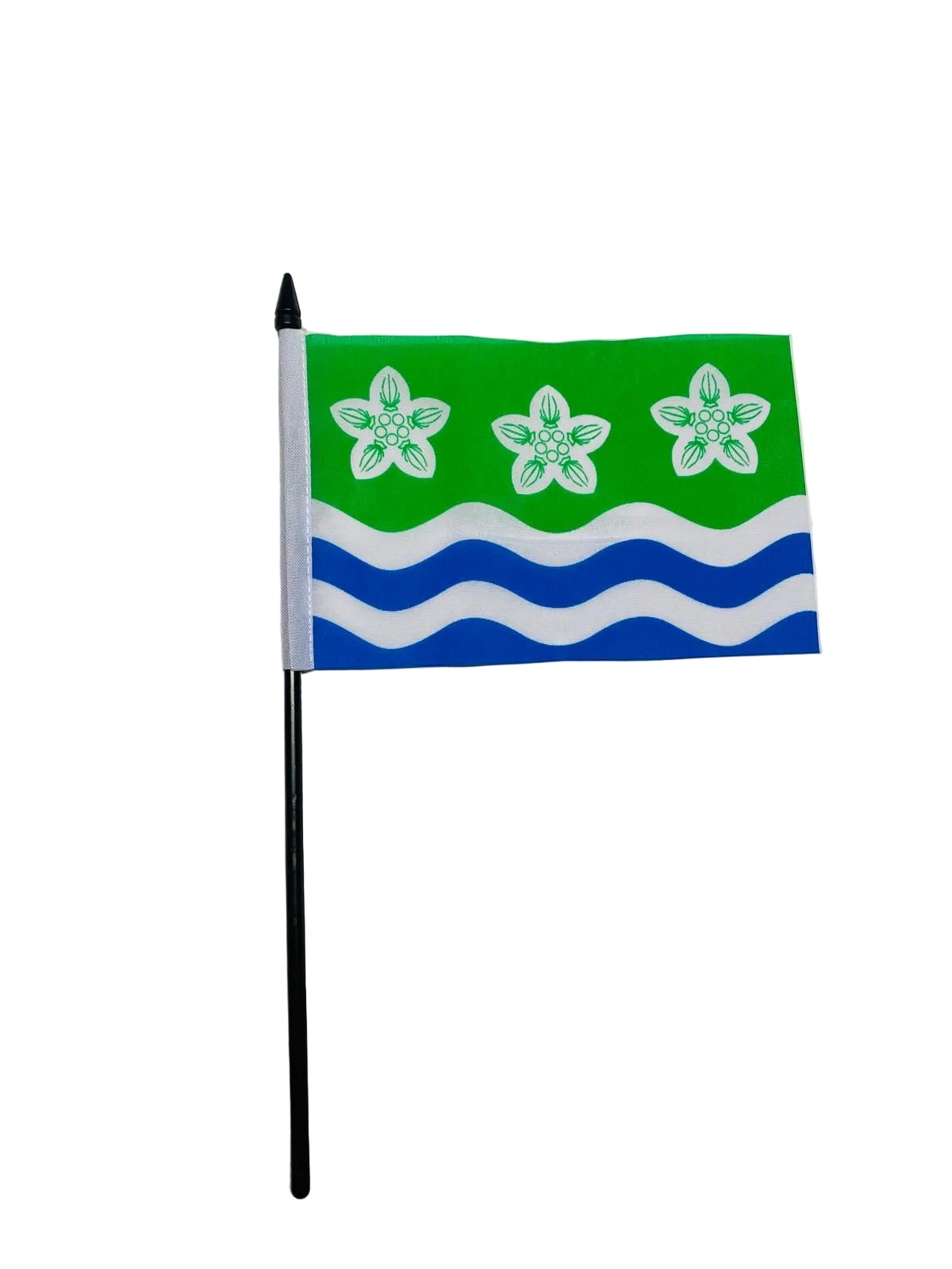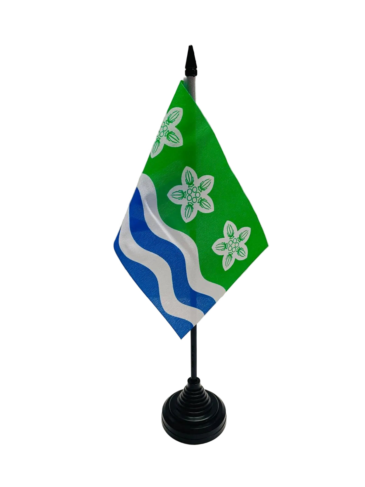 Cumberland Desk / Table Flags are 100% polyester on black plastic sticks.