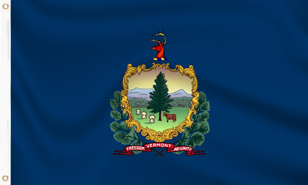 Vermont Flags are 100% premium polyester, suitable for indoor and outdoor use. Available as display flags (e.g. for flagpoles or wall displays), waving flags, and table flags.