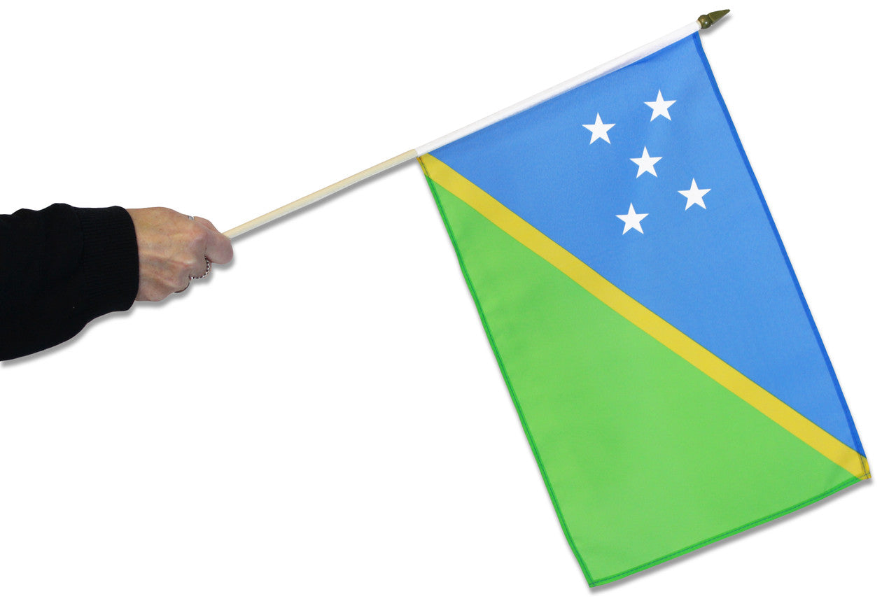 Solomon Islands Waving Flags are 100% polyester on wooden sticks, making them perfect for waving or displaying.