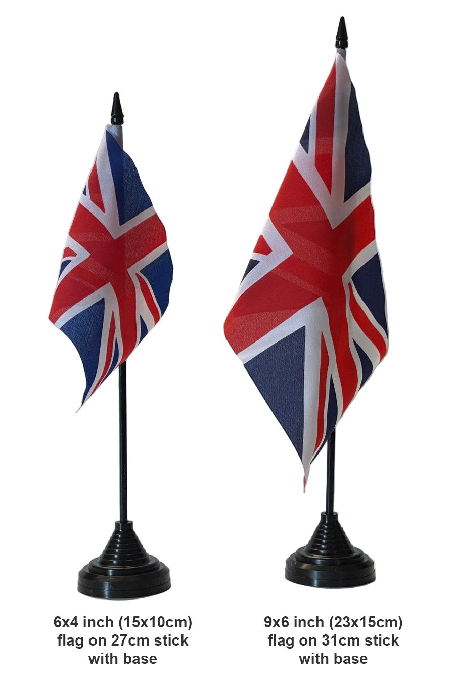 Union Jack Desk / Table Flags are 100% polyester on black plastic sticks.