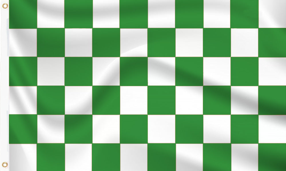 Green & White Chequered Flags are 100% premium polyester, suitable for indoor and outdoor use. Available as display flags (e.g. for flagpoles or wall displays), waving flags, and table flags.