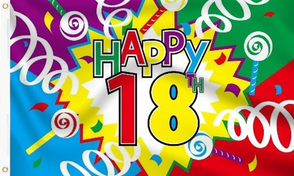 Happy 18th Birthday flags are 100% premium polyester, suitable for indoor and outdoor use. Available as display flags (e.g. for flagpoles or wall displays).