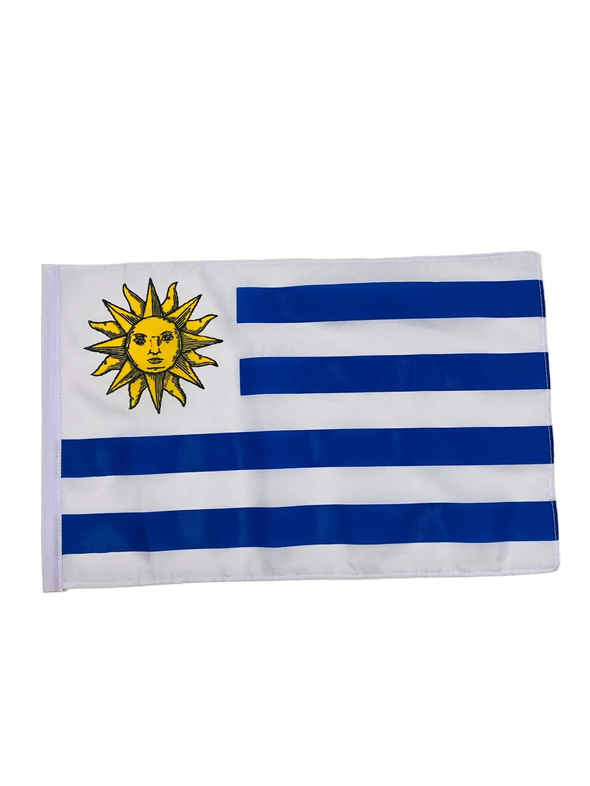 Our Uruguay flags are crafted from 100% premium polyester fabric, designed for both indoor and outdoor use. The Uruguay flag features nine horizontal stripes of white and blue, with a white square canton in the upper left containing the Sun of May. The stripes represent the nine original political departments, and the sun is the national symbol, representing the awakening of independence. Printed with fade-resistant inks to maintain colour accuracy in all weather conditions.