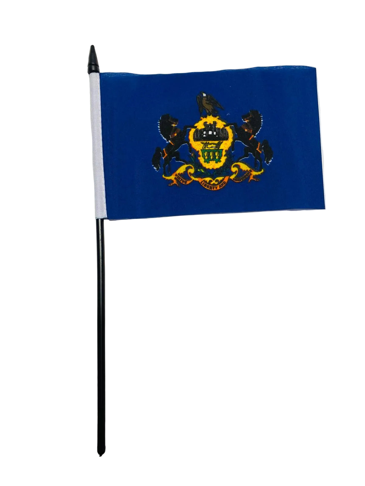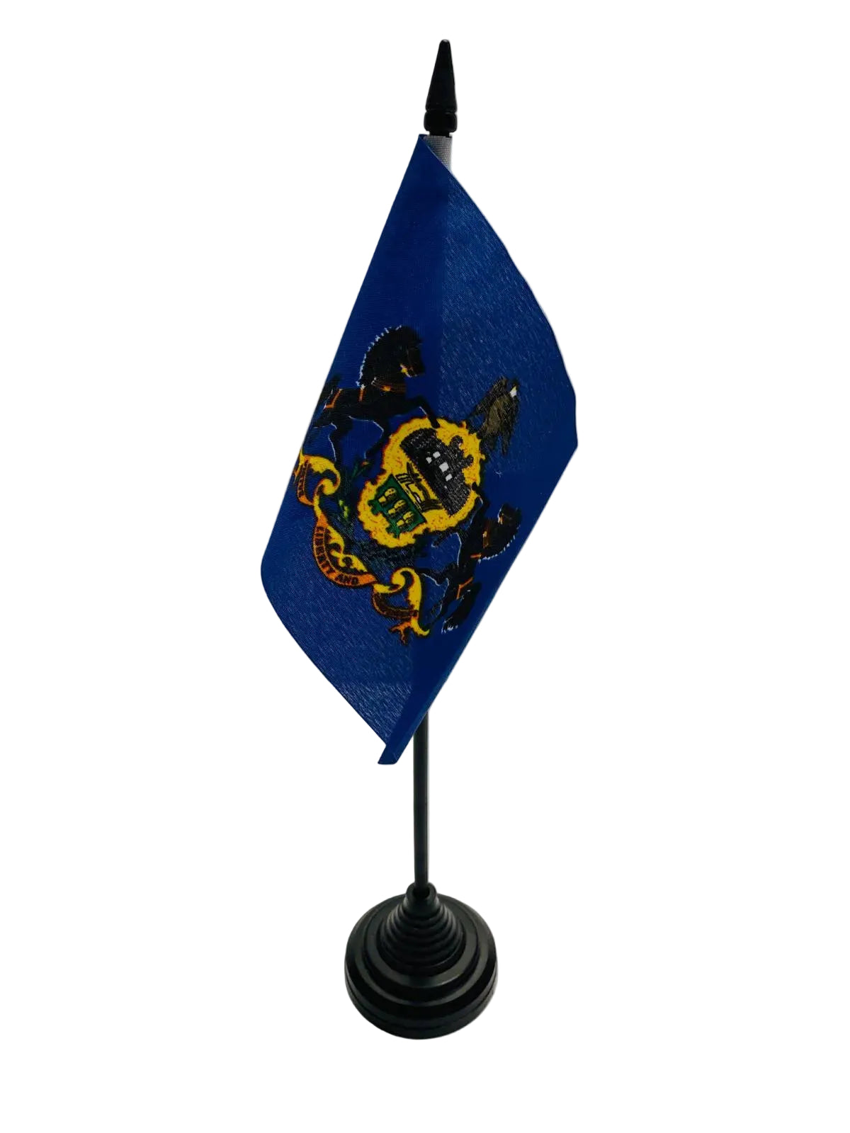 Pennsylvania Desk / Table Flags are 100% polyester on black plastic sticks.