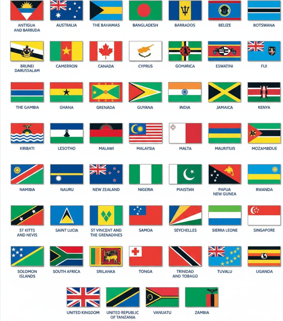 Antigua, Australia, Bahamas, Bangladesh, Barbados, Belize, Botswana, Brunei, Cameroon, Canada, Cyprus, Dominica, Estwatini, Fiji, Gabon, Gambia, Ghana, Grenada, Guyana, India, Jamaica, Kenya, Kiribati, Lesotho, Malawi, Malaysia, Maldives, Malta, Mauritius, Mozambique, Namibia, Nauru, New Zealand, Nigeria, Pakistan, Papua New Guinea, Rwanda, St Kitts, St Lucia, St Vincent, Samoa, Seychelles, Sierra Leone, Singapore, Solomon Islands, South Africa, Sri Lanka, Tanzania, Togo, Tonga, Trinidad & Tobago, Tuvalu, Uganda, United Kingdom, Vanuatu, Zambia.