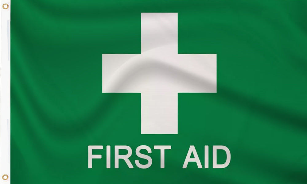 First Aid flags are 100% premium polyester, suitable for indoor and outdoor use. Available as display flags (e.g. for flagpoles or wall displays), waving flags, and table flags.