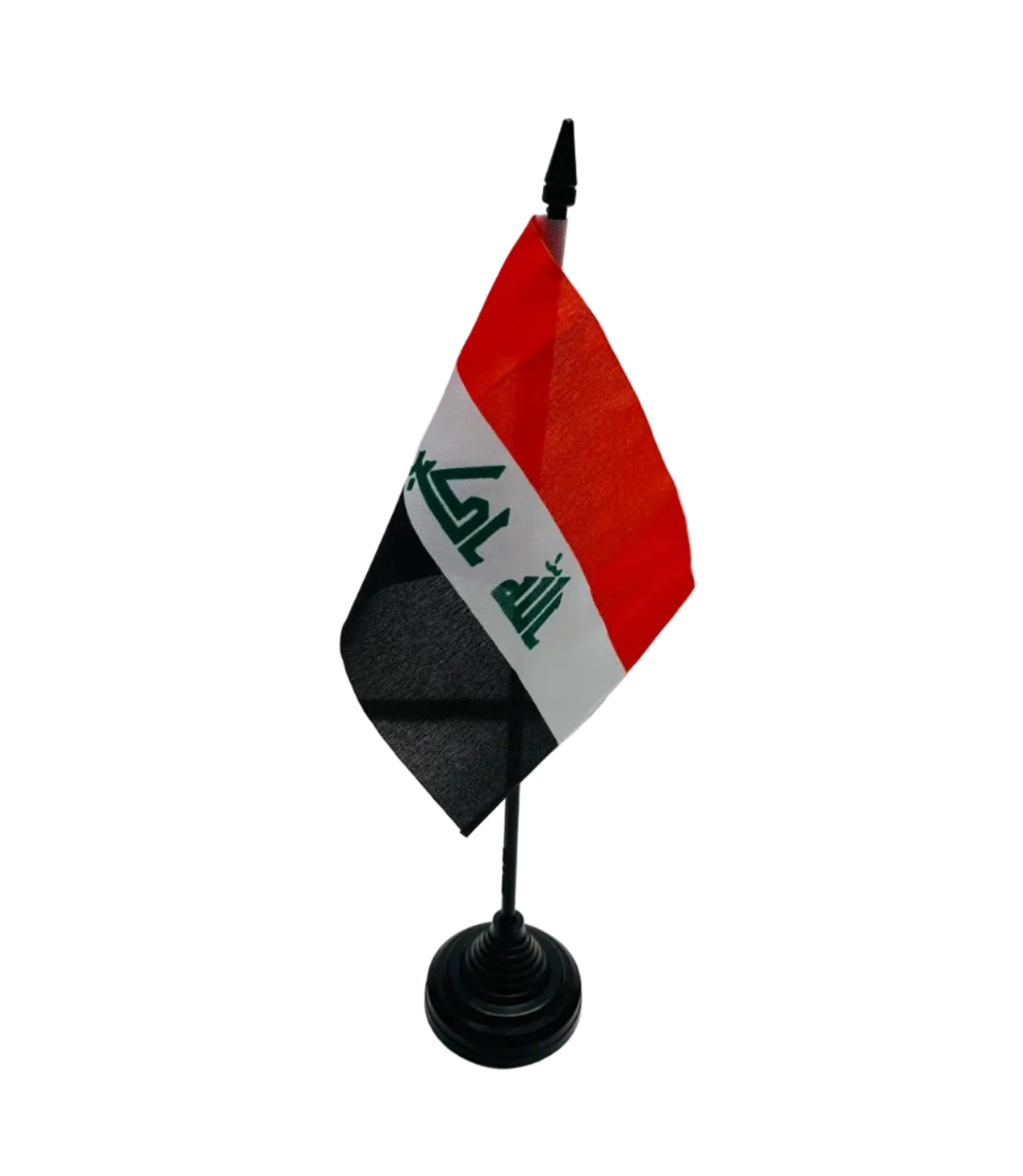 Iraq Desk / Table Flags are 100% polyester on black plastic sticks.