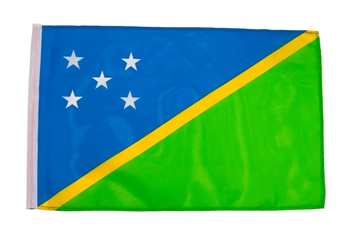 Our Solomon Islands flags are crafted from 100% premium polyester fabric, designed for both indoor and outdoor use. The Solomon Islands flag contains blue/green diagonal halves separated by a yellow stripe, with five white stars. Printed with fade-resistant inks to maintain colour accuracy in all weather conditions.
