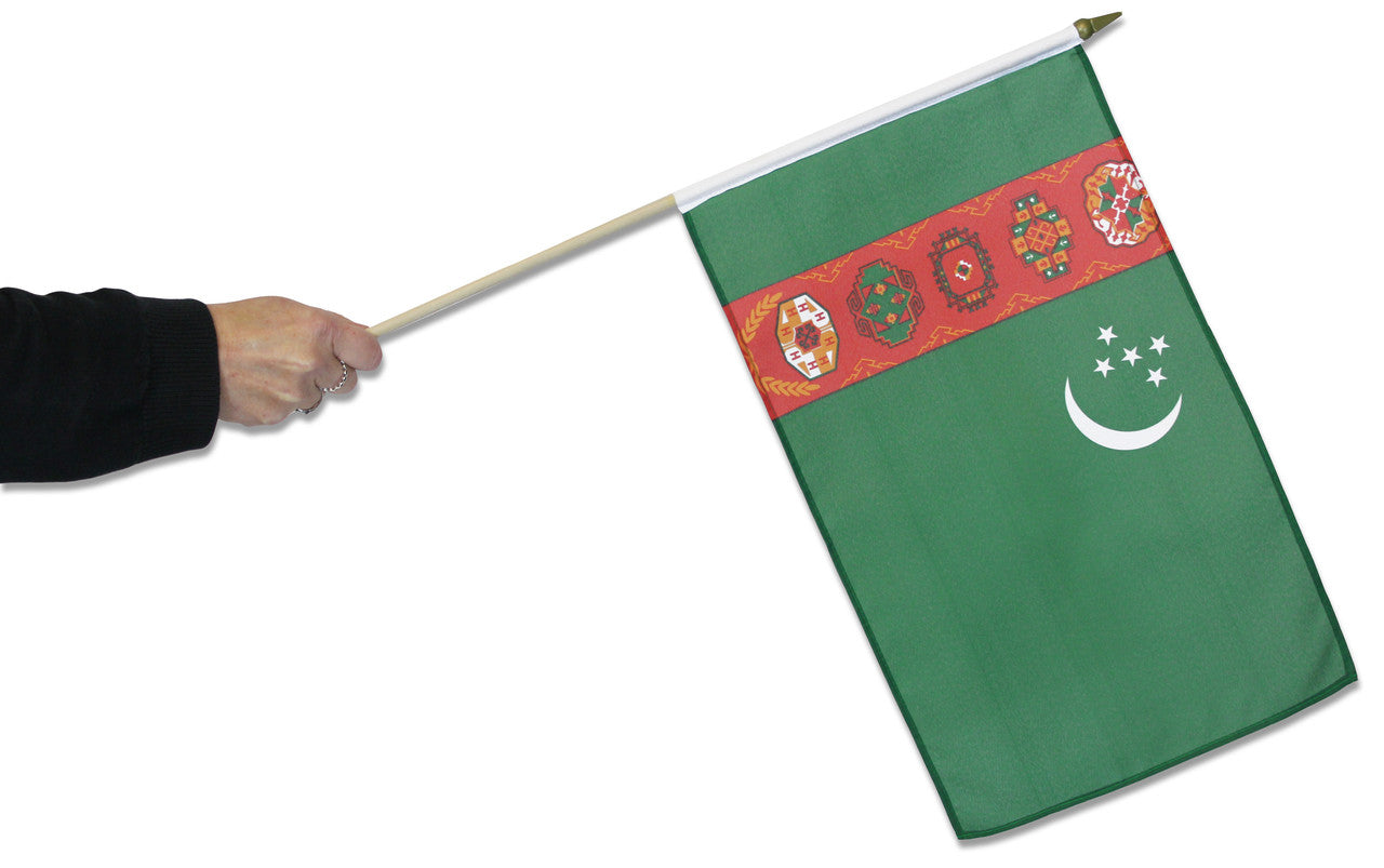 Turkmenistan Waving Flags are 100% polyester on wooden sticks, making them perfect for waving or displaying.