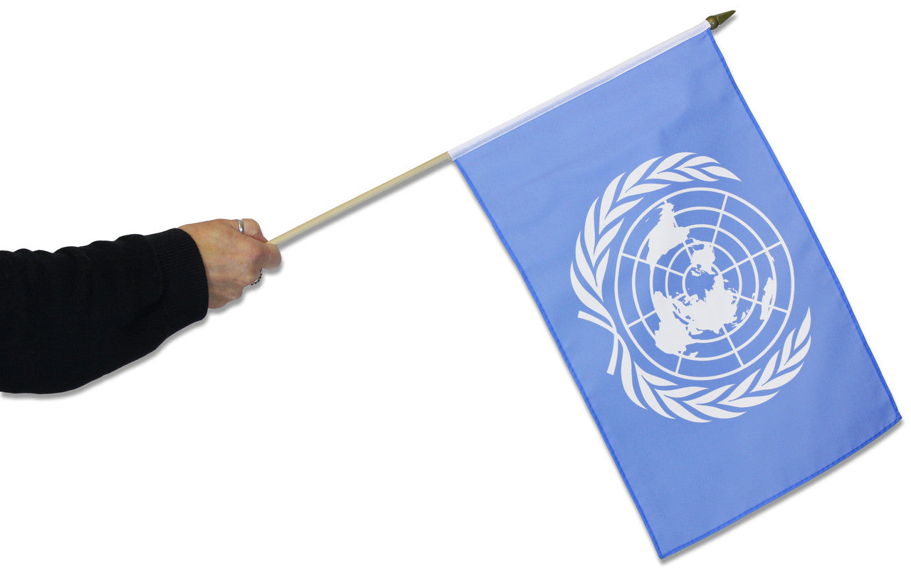 United Nations Waving Flags are 100% polyester on wooden sticks, making them perfect for waving or displaying.